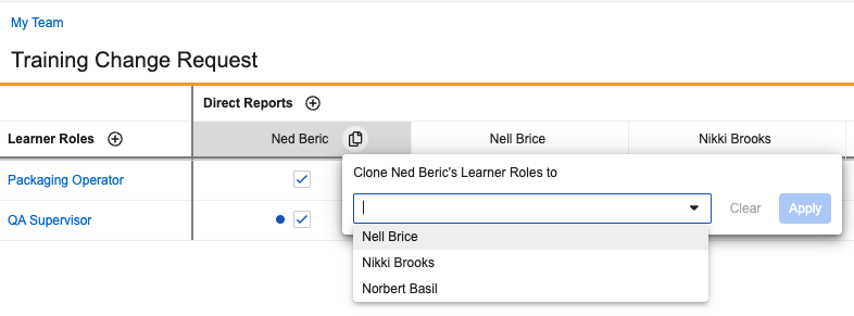 - Clone one team member’s Learner Role assignments to one or more other team members. This is useful for onboarding new team members or transitioning team members to a different role.