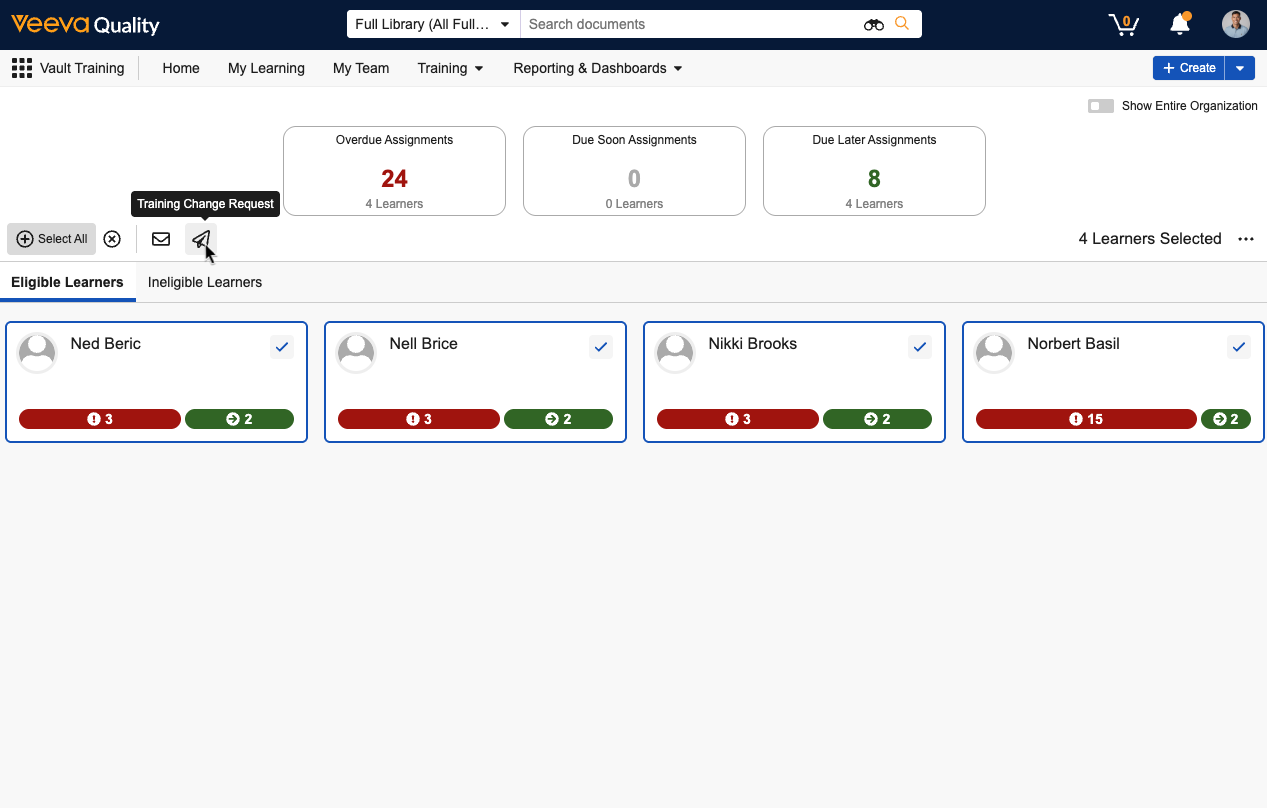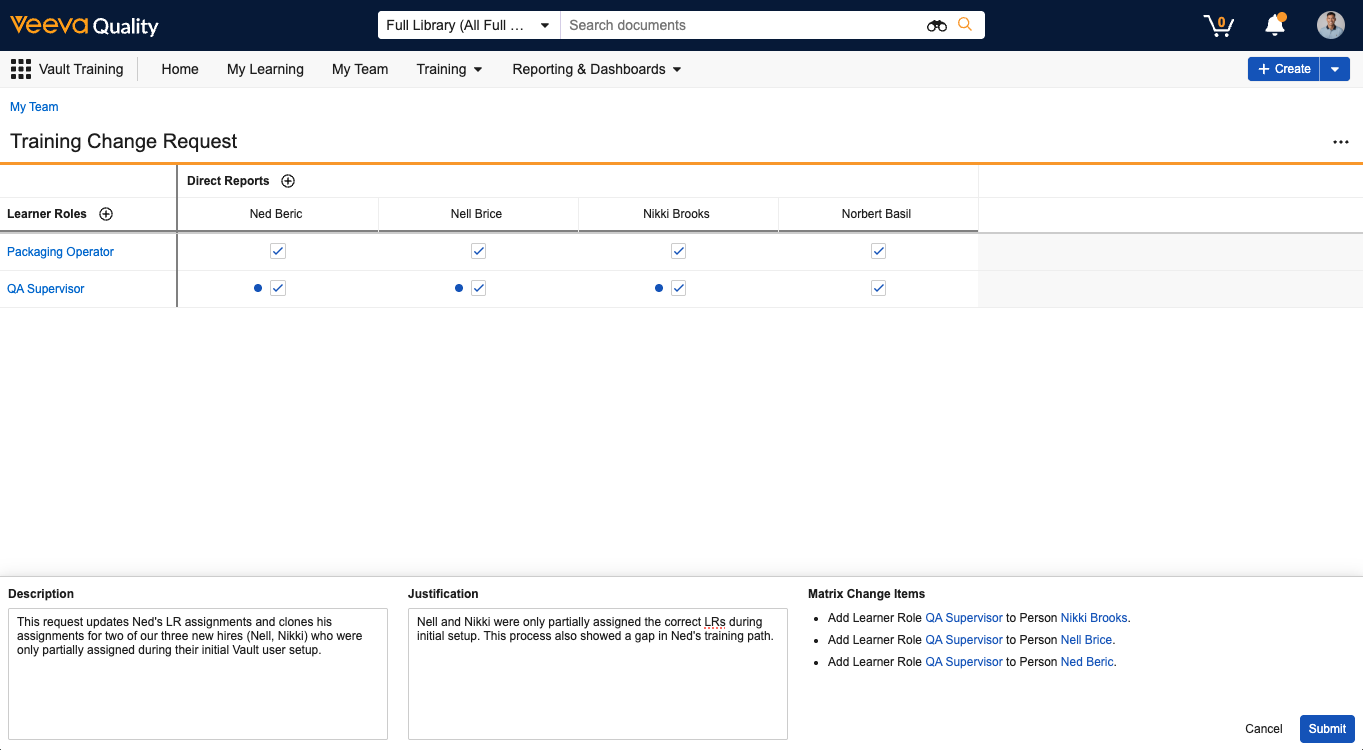 When Training Change Request is configured in your Vault, you can view and compare up to 20 of your direct reports’ Learner Role assignments, then submit a Training Change Request to update the Training Matrix accordingly.