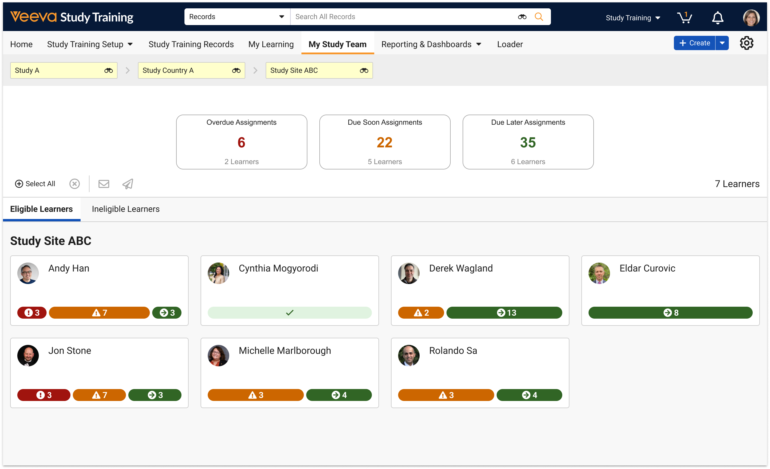 Note: The My Study Team page’s assignment counts exclude those for Learners who are not Vault users. Additionally, the page does not count assignments created outside of a Learner’s matrix. See Setting Up Veeva Study Training for more information.