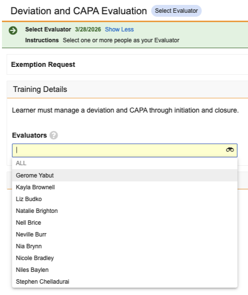 - Allow Learners to select from a list of prospective Evaluators for their training.