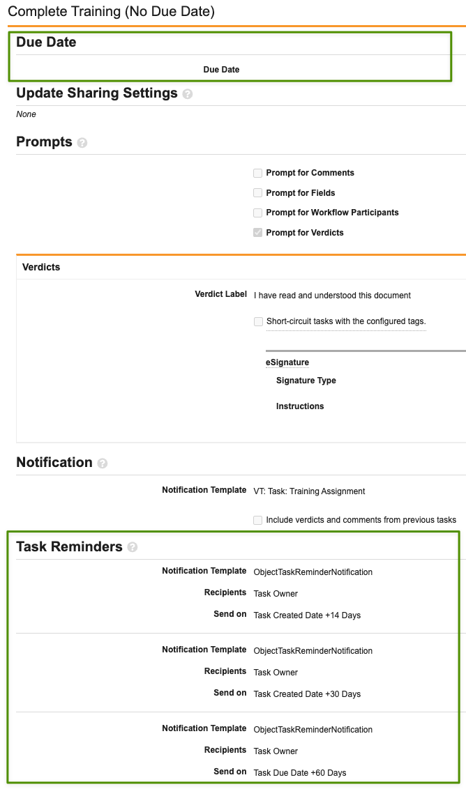 To configure the workflow for optional due dates, the VernBio Vault Admin first creates a new Complete Training (No Due Date) Task step. This step fully replicates the existing Complete Training task, with the exception of the due date and reminder options: For the new task, the Admin does not select a Due Date. While Task Reminders are optional, VernBio requires that Learners receive periodic reminders of training tasks. To do this, the Admin instead configures three reminders to notify Learners 14, 30, and 60 days from the day Vault assigns the task: