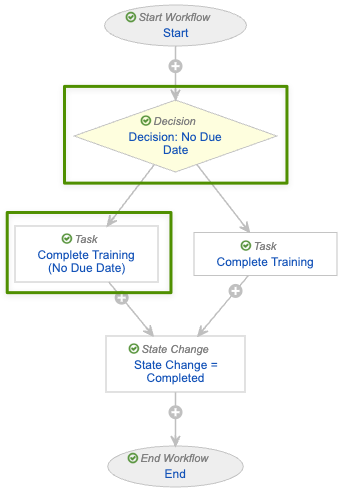 Then, the Admin creates a new Decision: No Due Date step to branch the workflow such that Learners receive the new no-due-date task only in certain cases. To do this, the decision step references the Due Date Timing field: When this field is No Due Date, Learners receive the new Complete Training (No Due Date) task. Otherwise, the workflow proceeds to the existing Complete Training task: